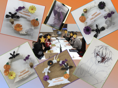 アートサークルでは、ハロウィンにちなんだ作品づくりに取り組みました。紙をくるくる巻いて模様を作る「ペーパークイリング」でリースを作ったり、タブレットでイラストを描いたり、ペーパークラフトで乗り物を作ったりと、それぞれが思い思いの創作を楽しみました。