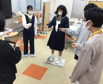 ミッション2▶▶▶ジャンケン(負けたら新聞紙を半分に。新聞の上に立てなくなったら負け)