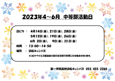 2023年度第1回目の中等部は4月14日(金)13時から14時50分です。