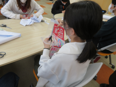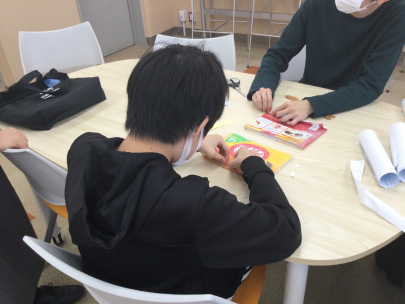 今回は、アートサークル体験ということで、お菓子の袋を使って「ポーチ製作」をしました!