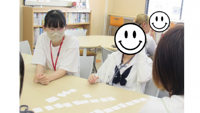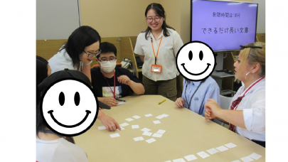 おなまえ作文とは、グループのメンバーの名前をひらがなで1文字ずつ書き、それを並び替えて1つの文にするというものです。最初は難しいという声が多かったですが、すべての文字を使い文を作ったグループも!また、名前を覚えるのが苦手な生徒も自然と名前を覚えることができ、中学生同士のたくさんコミュニケーションを取ることができました!