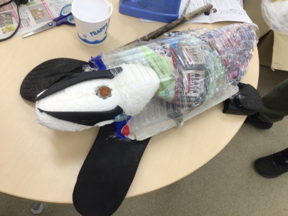 海岸で拾ったペットポトルや棒、スリッパなどを集め、生徒がグルーガンを使って一生懸命“何か”を作っていました。どのような作品ができるのか楽しみです♪