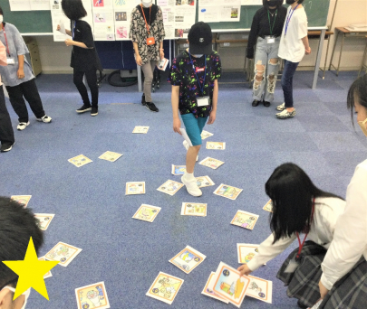 みんなでかるたをするのですが、場所を覚えにくくするためにグルグル回りながら取るという、難易度高めのやり方をしました。みんなで教室の中を走り回りながら、大盛り上がり!家ではできない大きさのかるたで、たくさん楽しんでくれました。