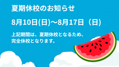 8月10日(日)~8月17日(日)は、夏期休校期間のため完全休校となります。