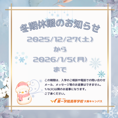 大阪キャンパスの冬期休暇のお知らせです!