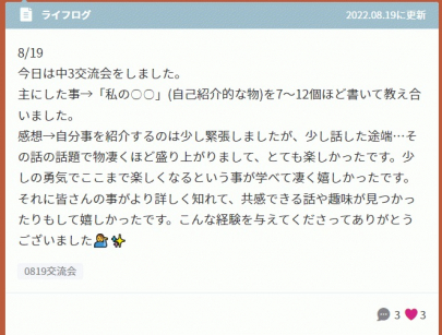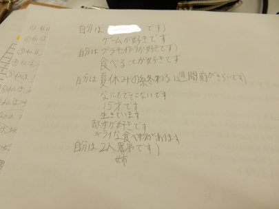 「私は○○です」という文章を10個作り、相手の項目の中から気になったものについて取り上げておしゃべりをする、というワーク形式で行ったのですが、これが大盛り上がり。