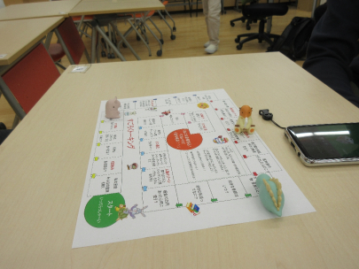 普通のすごろくですが止まったマス目に書いてあるお題について話す、というものです。