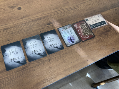 事件の内容が書かれたカードに沿って手札にある証言を問いただしたり、理由を述べたりする中でそれぞれの役割にそってストーリーを考えていきます。そして、犯人が決まったら「エンディングカード」を引いてストーリーの終焉が決まります。