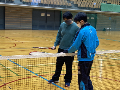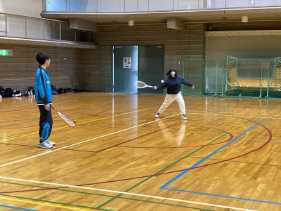 経験者の先輩からラケットの持ち方やコツを教わりました!