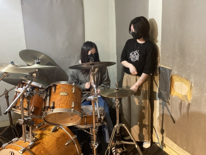 今年入学した方は先輩と一緒にドラムの初体験!