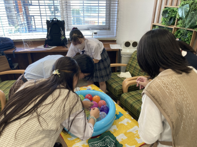 「水風船(ヨーヨー)釣り」や「型抜き」、「輪投げ」や「たこ焼きの出店」などを出店し、在校生・中等部生ともに楽しむことができました。