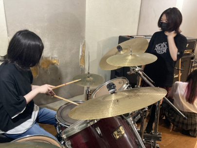 また、中等部生の参加も継続しており、今回は一段難しいリズムをドラムで練習してくれました。前回までは右足で踏んで鳴らす「バスドラム」のリズムを、1つから2つに増やすことにチャレンジしてみました。演奏し始めの1テンポめで鳴らしていたものを1と4テンポ目で鳴らすことを意識して練習したところ、基礎的なリズムができていたため少しずつ確認しながら進め、数回連続で鳴らすことができました。