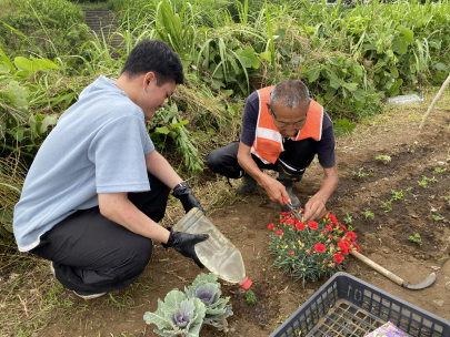 足元に気をつけながらごみを拾ったり、雑草だらけの花壇をきれいにしてから花を植えたりと