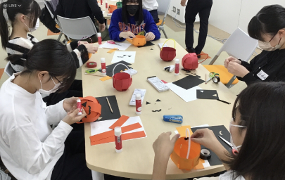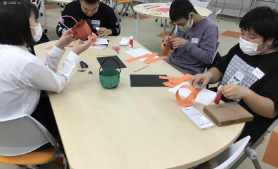 2023.11.30 中等部ホームルーム ~ハロウィンイベント~ ハロウィンの工作を行いました!今回はお菓子を入れられるような、ジャックオーランタンを手作りしました。コミュニケーションゲームなども行い楽しみながら活動できました!