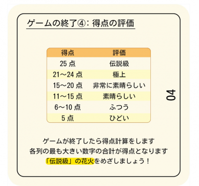 ゲーム終了時に最大25点 (5色 × 5点 ) で得点が出ます。