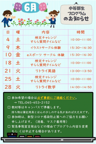 2022.06.01 【お知らせ】6月中等部体験のお知らせ こんにちは。横浜キャンパスです! 第一学院中等部は、家庭や学校以外の、もう一つの居場所となります。 6月体験会の日程をお知らせします。 参加希望の方は、下記までご連絡ください。 第一学院 中等部 横浜キャンパス お電話:045-453-2152 メール:yokohama@daiichigakuin.jp 資料請求のお申込:こちら 個別相談のお申込:こちら