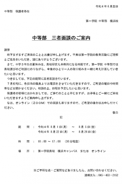 中等部の皆さんには、夏休みを利用して三者面談を行います。